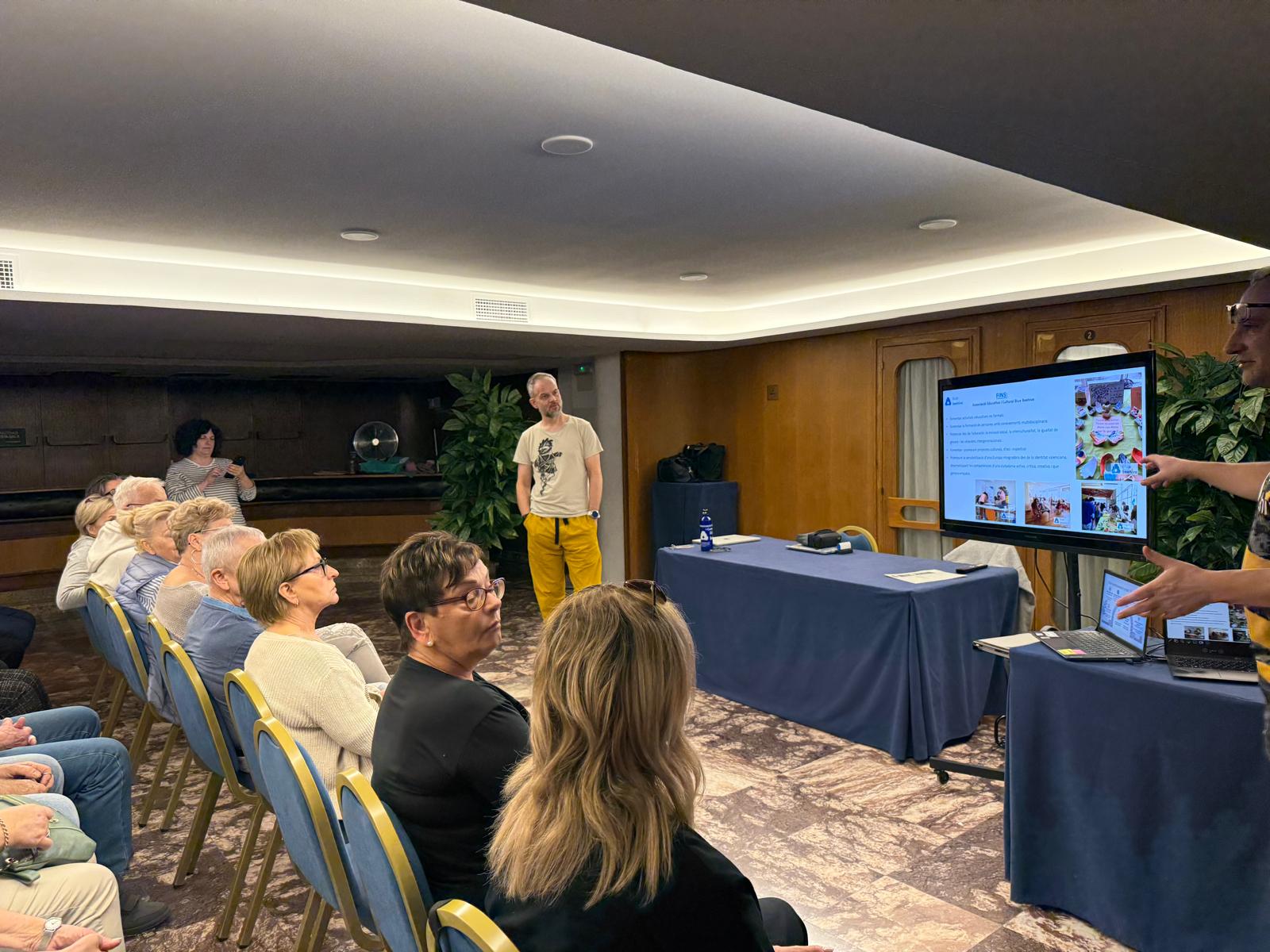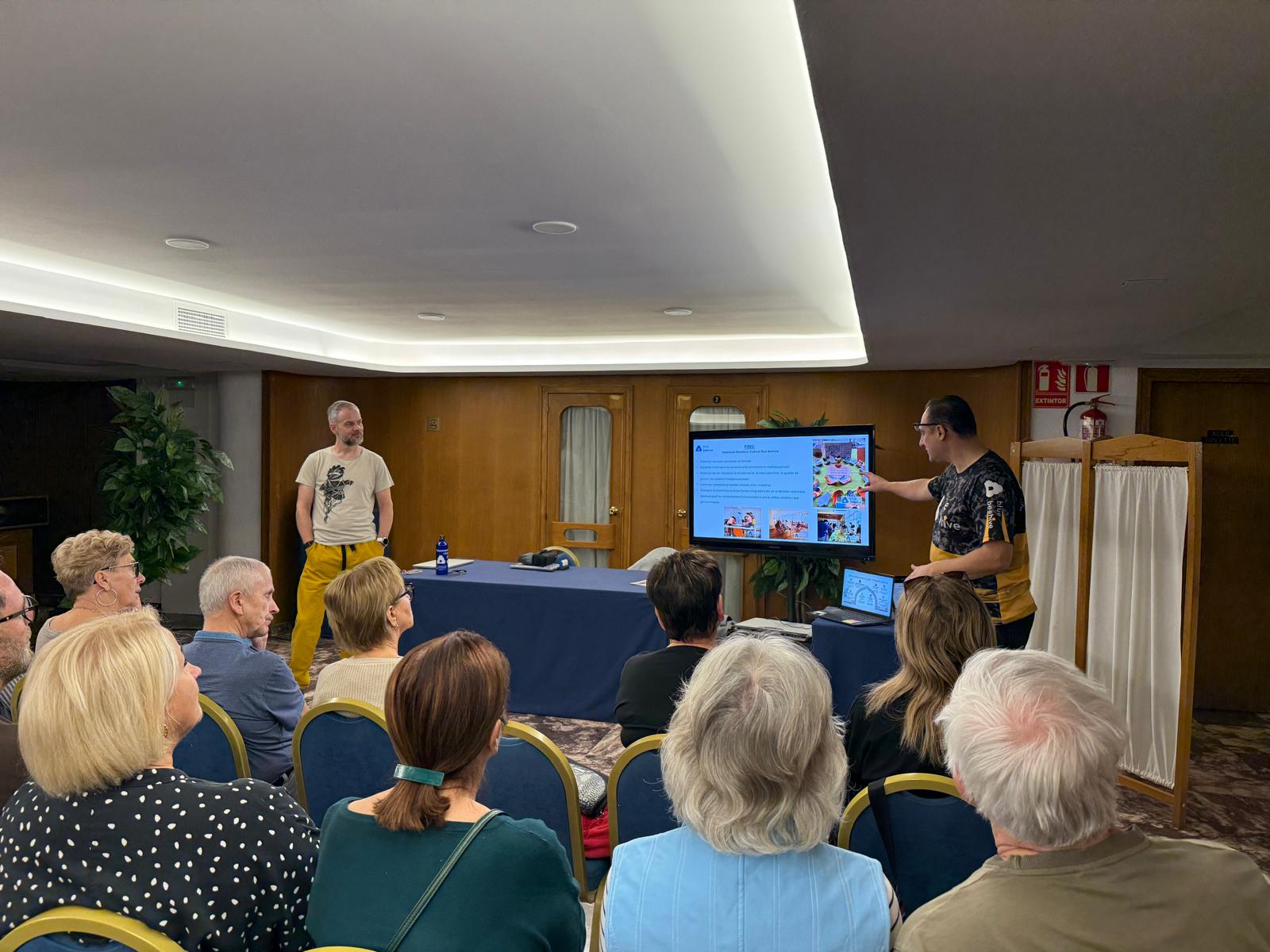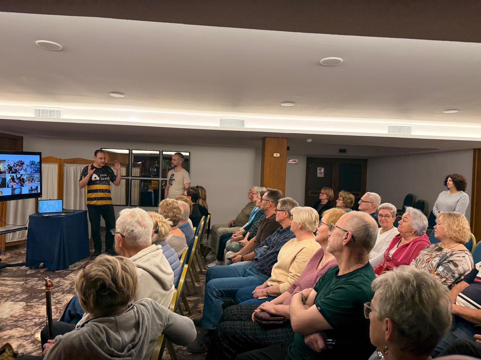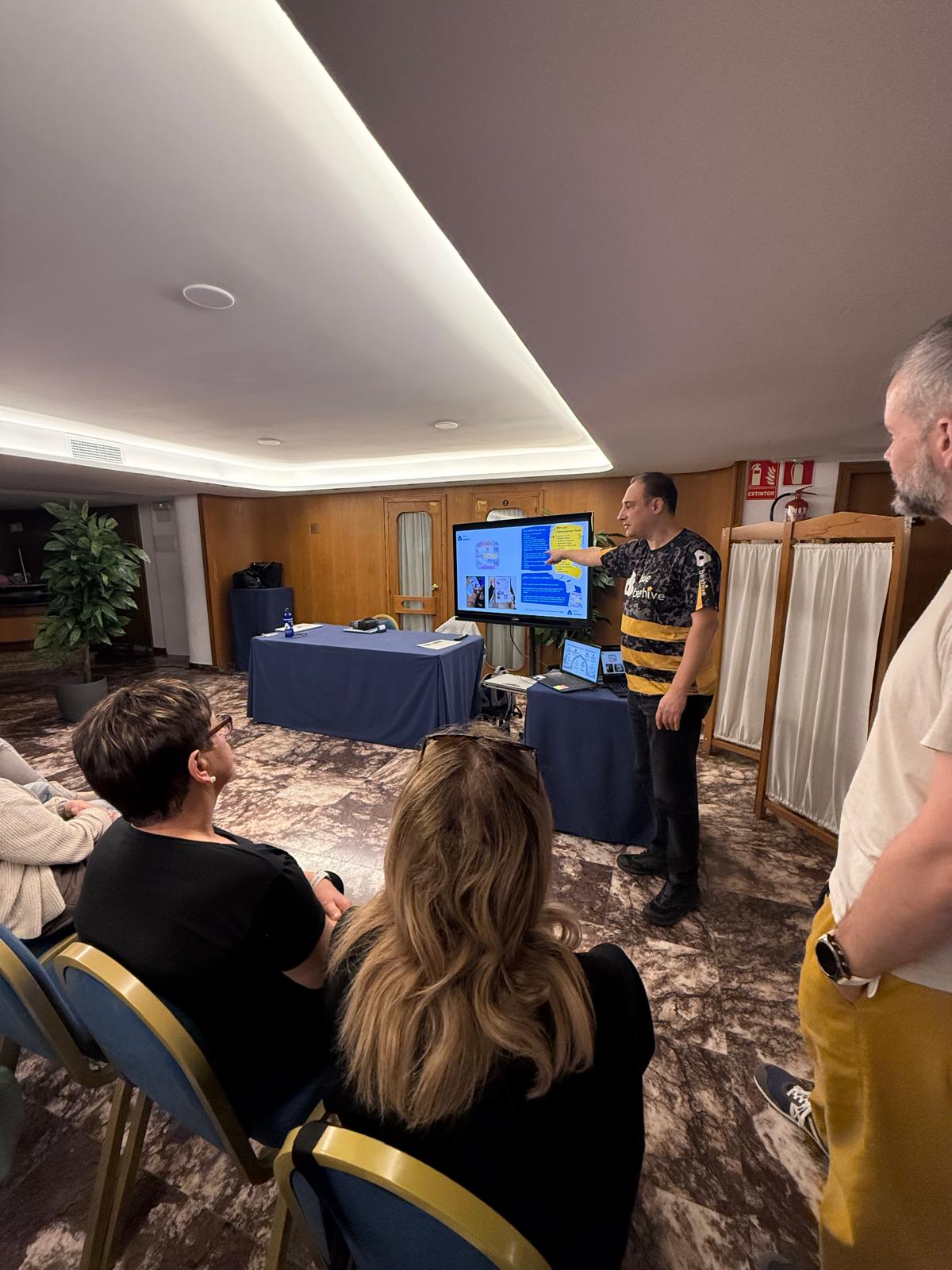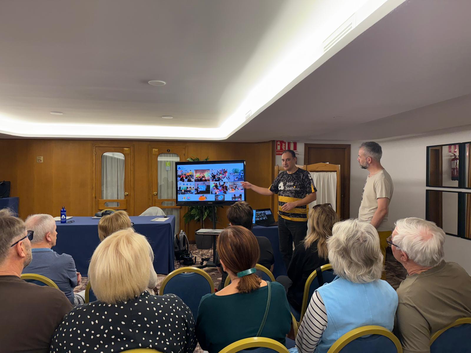 Dzień rozpoczęliśmy od prezentacji działalności naszego partnera – Associació Educativa i Cultural Blue Beehive. Prezentacja pokazała, jak w praktyce realizowane jest wsparcie seniorów poprzez edukację, aktywizację społeczną i rozwój kompetencji cyfrowych. Sesja pytań i odpowiedzi pozwoliła uczestnikom lepiej zrozumieć lokalne dobre praktyki oraz inicjatywy, które realnie odpowiadają na potrzeby osób starszych.